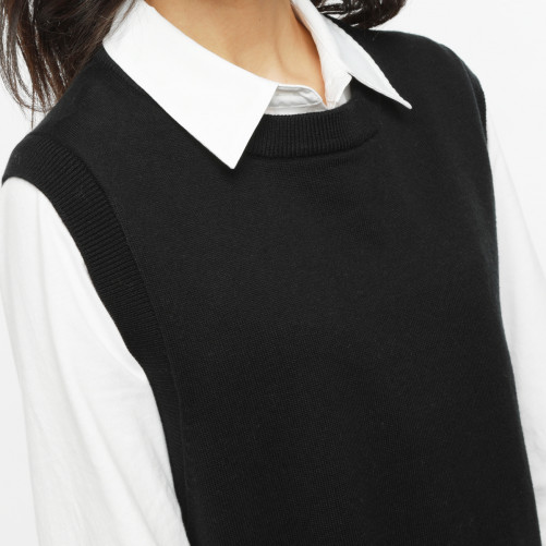 Pull sans manche uni Sans manche Col rond Maille fine Couleur unie Pan arrière plus long Composition:47% ACRYLIQUE 38% COTON 15% POLYAMIDE Entretien:Lavage maximum à 30°C. Ne pas blanchir. Ne pas sécher. Repassage au fer température maximale à 110°C. Ne pas nettoyer à sec. _x000D_